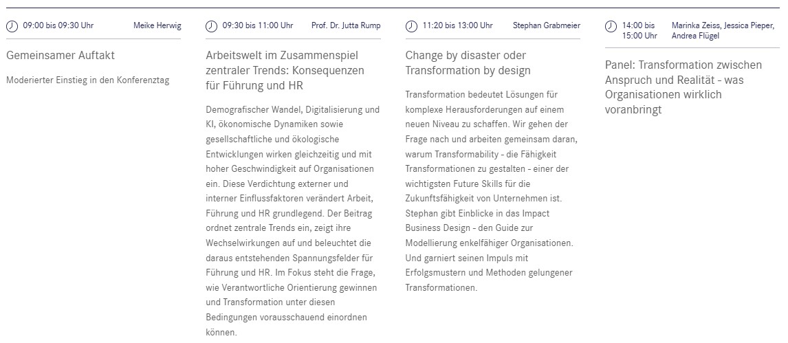 Die Konferenz richtet sich an HR-Verantwortliche und Führungskräfte, die Transformation aktuell mitverantworten, steuern oder begleiten und dabei mit widersprüchlichen Anforderungen konfrontiert sind. Angesprochen sind Personen, die Orientierung suchen, um Prioritäten klarer zu setzen, Position zu beziehen und Transformation intern überzeugend zu vertreten.